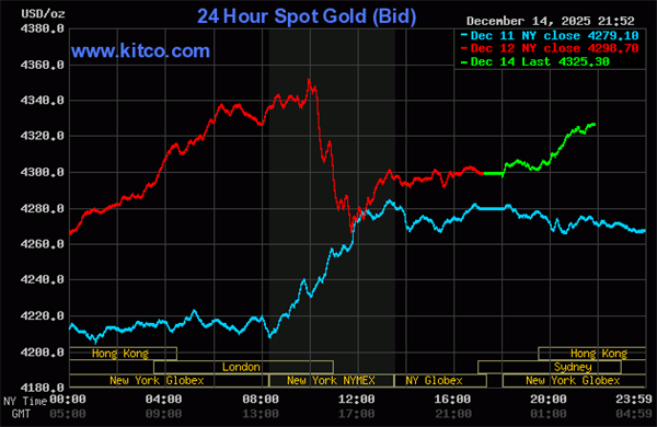 Giá vàng thế giới phiên đầu tuần đi lên. Lúc 08h49 ngày 15/12 (giờ Việt Nam), giá vàng thế giới giao ngay ở mức 4.320,8 USD/ounce, tăng 22,1 USD/ounce so với kết tuần qua.