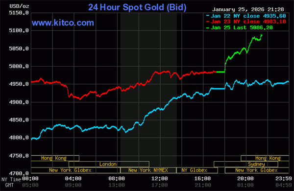Mở cửa phiên giao dịch sáng 26/1, giá vàng thế giới giao ngay tăng hơn 100 USD lên 5.087 USD một ounce. Giới phân tích cho rằng nguyên nhân là nhà đầu tư tiếp tục mua vàng trú ẩn trong bối cảnh căng thẳng địa chính trị toàn cầu leo thang.
