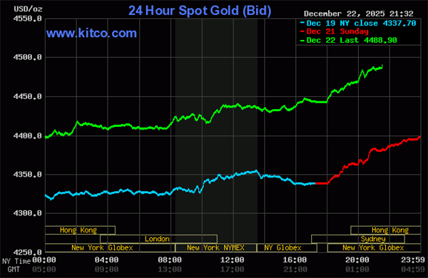 Giá vàng thế giới giao ngay trên thị trường châu Á lúc 9h45 sáng nay ngày 23/12 (giờ Việt Nam) giao dịch ở quanh ngưỡng 4.490 USD/ounce, tăng mạnh 133 USD/ounce so với cùng thời điểm hôm qua.