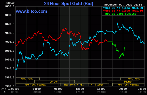 Theo đó, giá vàng thế giới hôm nay 3/11 giao ngay trên thị trường châu Á mở cửa phiên giao dịch đầu tuần ở mức 4.002,28 USD/ounce. Sau hơn 20 phút giao dịch (thời điểm 6 giờ 21, giờ Hà Nội), giá vàng giao ngay trên thị trường châu Á đứng ở mức 3.988,48 USD/ounce và hiện tại đang giao dịch ở mức 3995,7 USD/ounce.